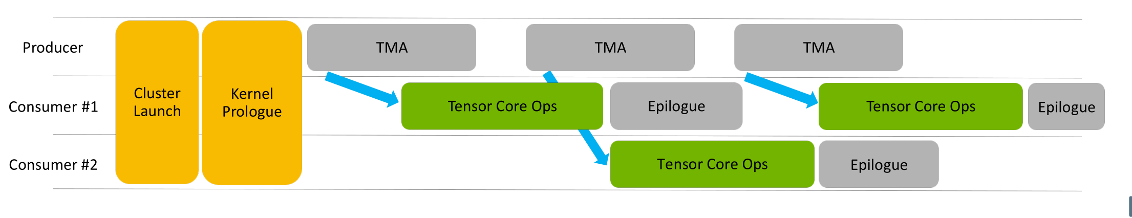 Recalling the following diagram from Lecture 8, you may find it beneficial to overlap TMAs with two sets of consumers as to keep the Tensor cores busy.
