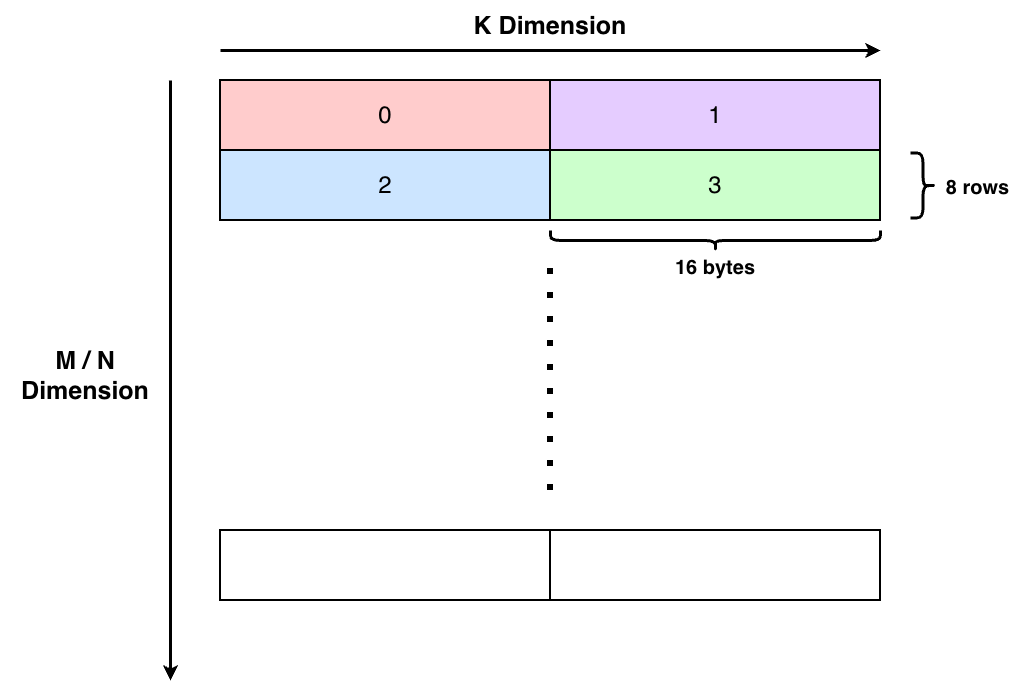 memory. For the non-swizzled case, each core matrix is 8 × 16 bytes in size. It is important to note that the values within each core matrix must be contiguous and K-major, meaning that you can’t directly copy the whole matrix