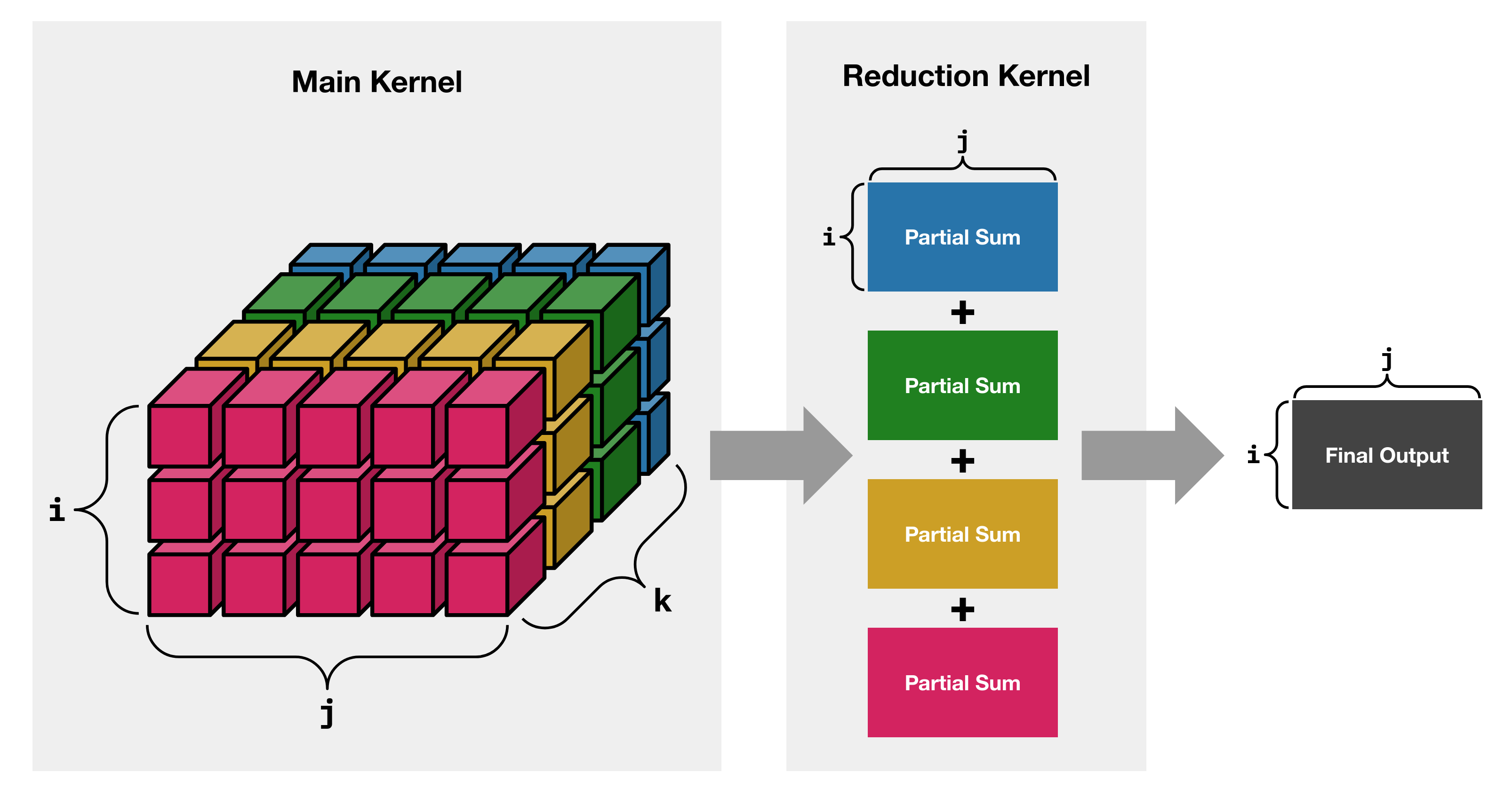 The reduction kernel computes the final output by combining the partial sums.