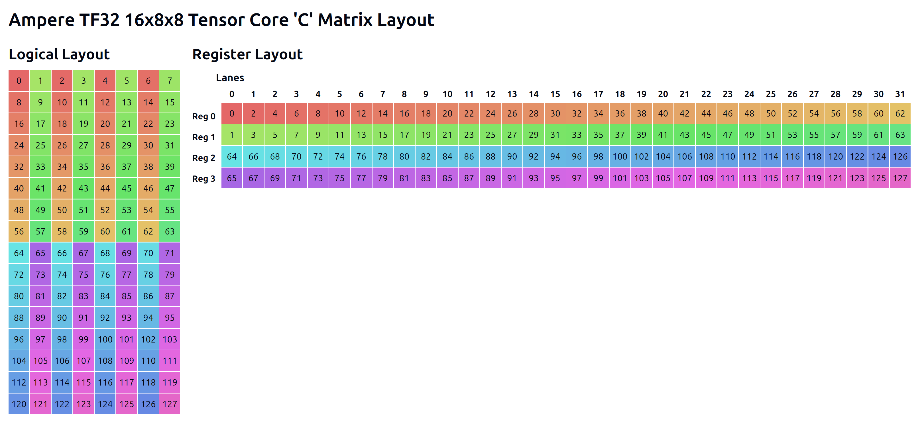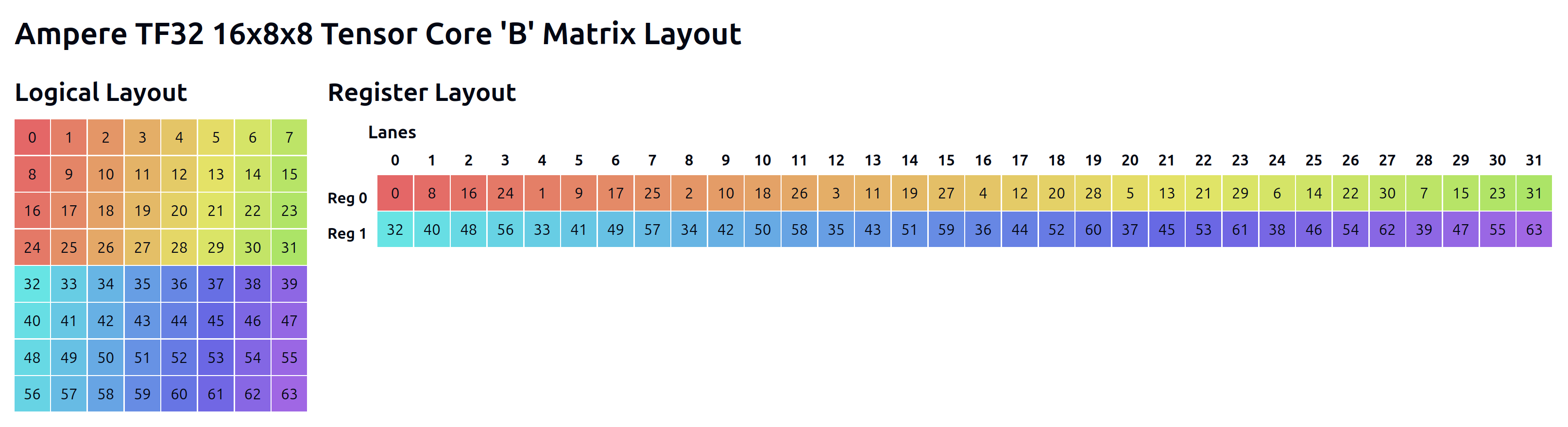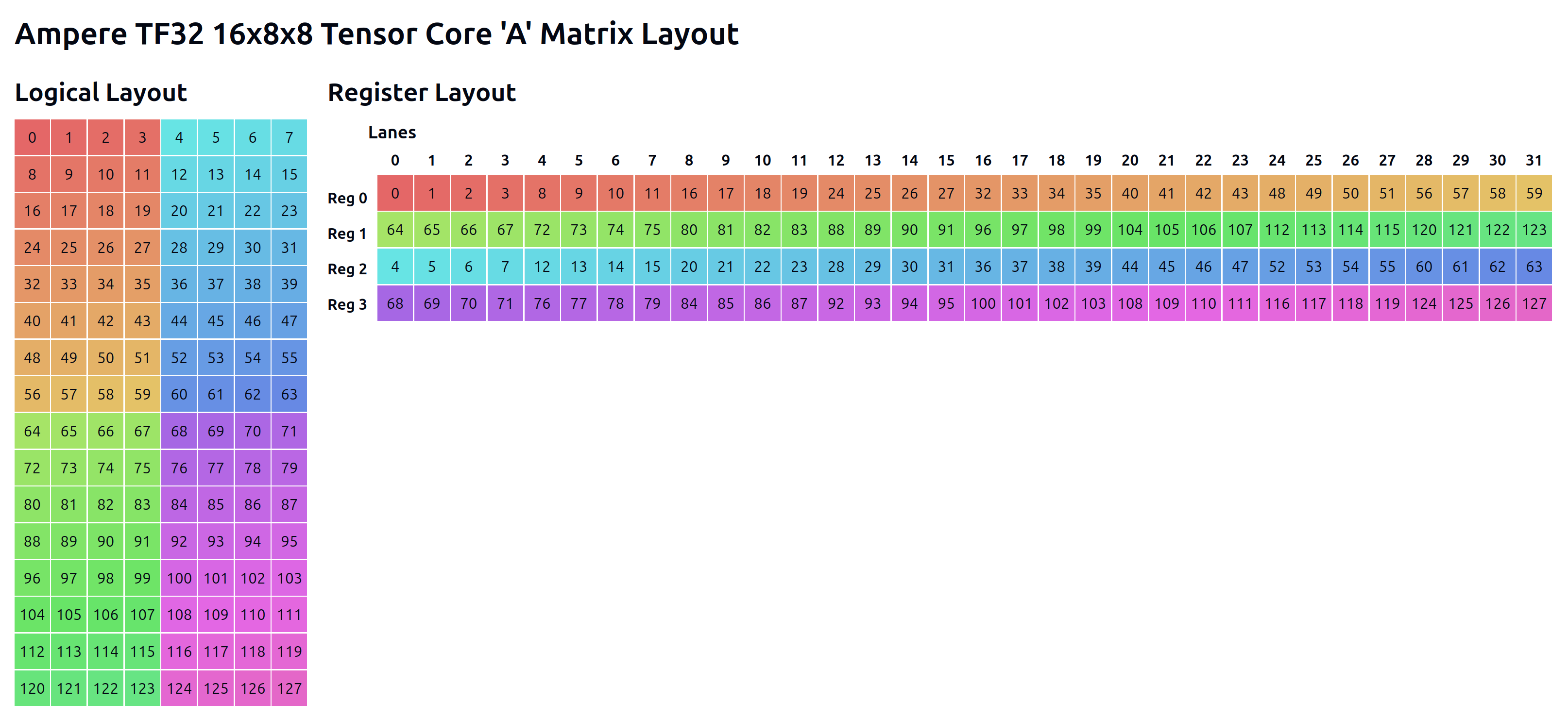 With all of that in mind, let’s take a look at how the m16n8k8 instruction we’re using actually expects data to be laid out in registers. First, a bit of math: